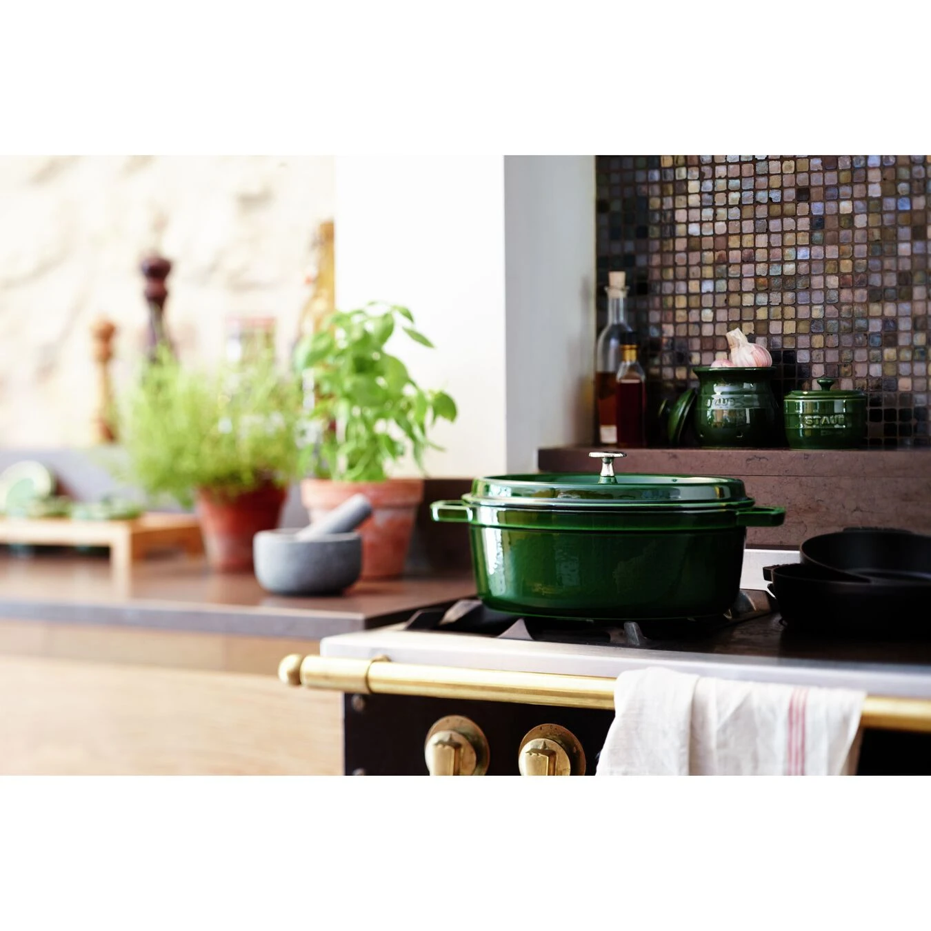 Ein Schmorgericht hat ein besonderes Aroma, ist leicht zuzubereiten und immer wieder eine große Überraschung, wenn es serviert wird. Eine Möglichkeit bei der Unterstützung der Zubereitung ist die Cocotte aus dem Hause Staub. Bei einer Cocotte handelt es sich um einen französischen Schmortopf, der bei leckeren Fisch-, Fleisch- oder Gemüsegerichten verwendet werden kann. Die Handhabung dieser ovalen Cocotte in Basilikumgrün ist einfach, da sie über einen großen, dicht schließenden Deckel und zwei Gusseisengriffe an den Seiten verfügt. Hinzu kommt, dass Sie dieses Produkt gut per Hand reinigen können: Schnell ist die ovale Cocotte in Basilikumgrün mit 6,7 l Fassungsvermögen und einem Durchmesser von 33 cm wieder im Einsatz. Eine Besonderheit ist, dass sie auf allen Herdarten verwendet werden kann, auch auf Induktionsplatten. Darüber hinaus besteht dieser Schmortopf aus mehreren Beschichtungen aus Gusseisen und Emaille. Außerdem wird eine schnelle und gezielte Wärmeverteilung garantiert, die vom Boden bis zum Deckel reicht. Die Innenbeschichtung ist mattschwarz und hilft den köstlichen Schmoreffekt zu intensivieren. Zusätzlich verbessert sich die Emaillierung, je öfter die Cocotte im Einsatz ist. Mit der Cocotte aus dem Hause Staub servieren Sie herrliche Schmorgerichte und begeistern Ihre Freunde und Familie mit einer herzhaften Mahlzeit.