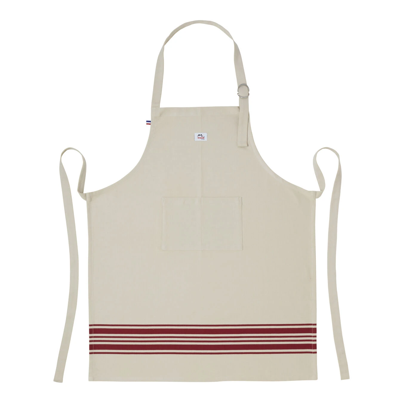 Kochen macht Spaß, aber es kann auch ein wenig schmutzig werden. Schützen Sie sich und Ihre Kleidung mit dieser praktischen Schürze vor Spritzwasser, Fett oder verschütteter Tomatensauce. Auch der Akt, die Schürze vor dem Kochen oder Backen anzulegen, kann ein angenehmes Ritual sein, das Ihnen hilft, in Stimmung zu kommen, köstliche Speisen zu kreieren.Die STAUB-Schürze hat die klassische Trägerform, auch bekannt als französische Kochschürze. Sie ist in der Größe von 70 x 85 cm erhältlich und passt den meisten Erwachsenen durch das verstellbare Umhängeband und die langen Seiten-Bänder. Die große Fronttasche ist in zwei Segmente unterteilt, um Kochutensilien oder ein Telefon bequem unterzubringen.Die Schürze aus 100 % Baumwolle ist waschmaschinenfest und sehr langlebig. Das zeitlose Design mit dunkelroten Streifen auf cremefarbenem Hintergrund passt harmonisch zu einer ländlichen Küche und einem modernen Restaurant. Ein kleines Etikett mit roten, weißen und blauen Streifen erinnert an das französische Erbe von STAUB.