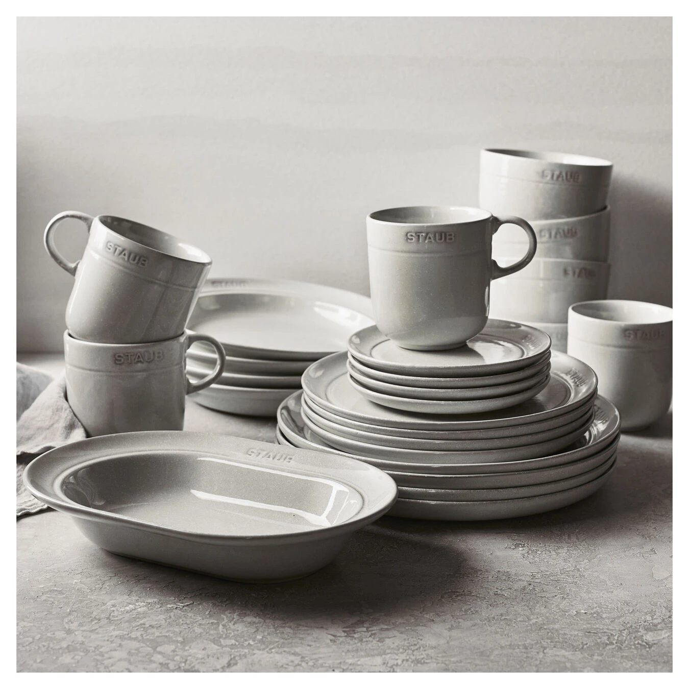 Unser ovaler Teller hat einen Durchmesser von 25 cm und eignet sich für Reis und Curry oder großzügige Portionen Gulasch, Auflauf oder andere Eintopfgerichte. Wie alle Keramikprodukte von STAUB ist dieser Teller aus hochwertigem Material hergestellt und mit einer Emailleschicht überzogen, die ihn besonders langlebig macht. Sie können ihn tagtäglich verwenden, in die Mikrowelle stellen, im Geschirrspüler waschen, ihn stapeln, ohne dass er verkratzt, und sich für lange Zeit an seinem eleganten Glanz erfreuen, Die dezente Farbe bildet den perfekten Hintergrund für farbenfrohe, geschmacksintensive Speisen.